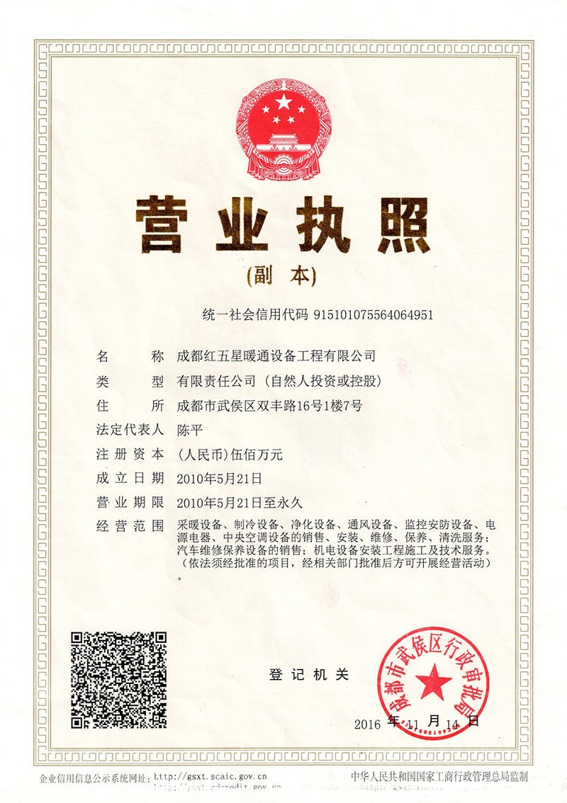 成都紅五星暖通設(shè)備工程有限公司營業(yè)執(zhí)照